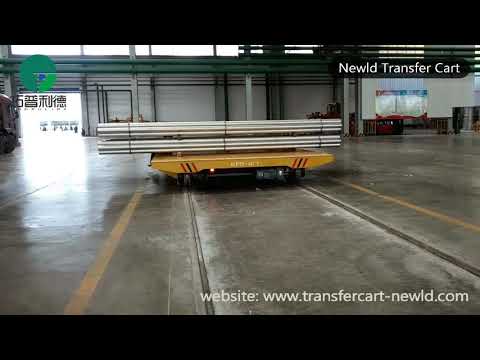 The material transfer cart for steel pipe handling is a kind motorized flatbed rail cart for workshop material handling, which is powered by Low voltage rail.